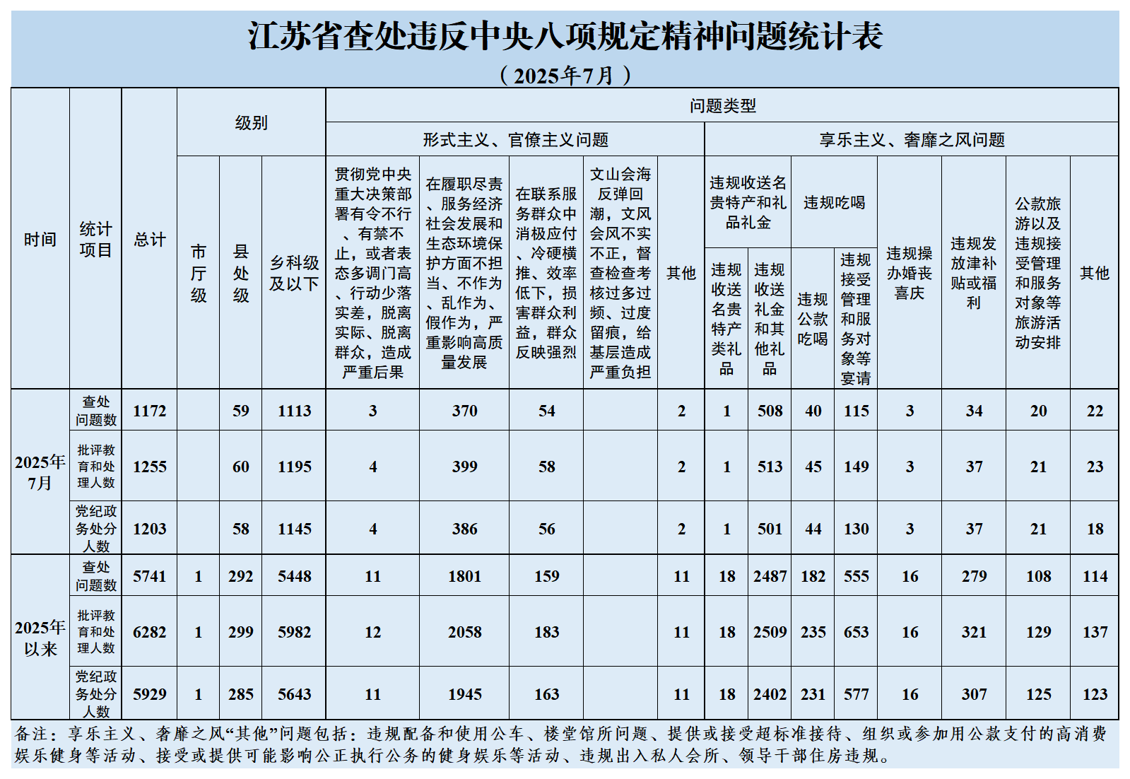 为掌握全省贯彻落实中央八项规定和省委十项规定精神情况,江苏省纪委监委在设区市、省级机关部门、省属国有企业、高校等建立了落实中央八项规定精神情况月报制度,每月定期向社会发布全省查处“四风”问题情况,释放落实中央八项规定精神越往后盯得越紧、执纪越严的强烈信号,推动党风政风和社会风气持续好转。2025年7月,全省共查处违反中央八项规定精神问题1172起,批评教育和处理1255人、其中给予党纪政务处分1203人。从问题类型看,查处形式主义、官僚主义问题429起、批评教育和处理463人,查处享乐主义、奢靡之风问题743起、批评教育和处理792人。从人员级别看,批评教育和处理县处级干部60人、乡科级及以下人员1195人。