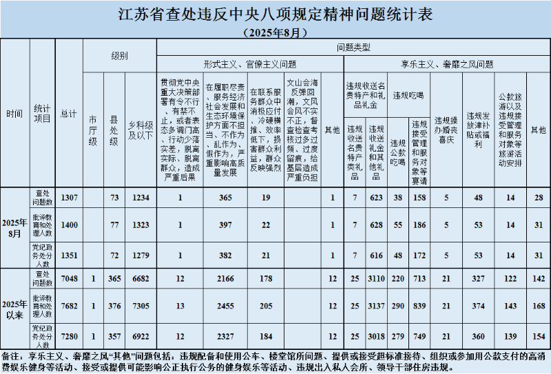 2025年8月,全省共查处违反中央八项规定精神问题1307起,批评教育和处理1400人、其中给予党纪政务处分1351人。从问题类型看,查处形式主义、官僚主义问题386起、批评教育和处理421人,查处享乐主义、奢靡之风问题921起、批评教育和处理979人。从人员级别看,批评教育和处理县处级干部77人、乡科级及以下人员1323人。