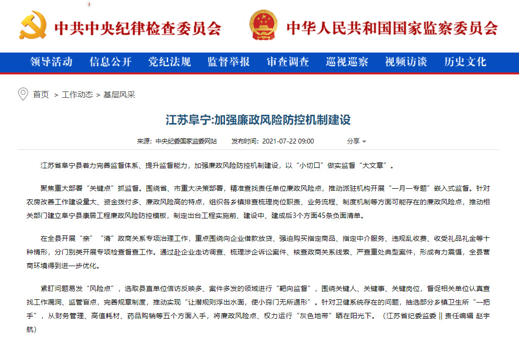 江苏省阜宁县着力完善监督体系、提升监督能力,加强廉政风险防控机制建设,以“小切口”做实监督“大文章”。